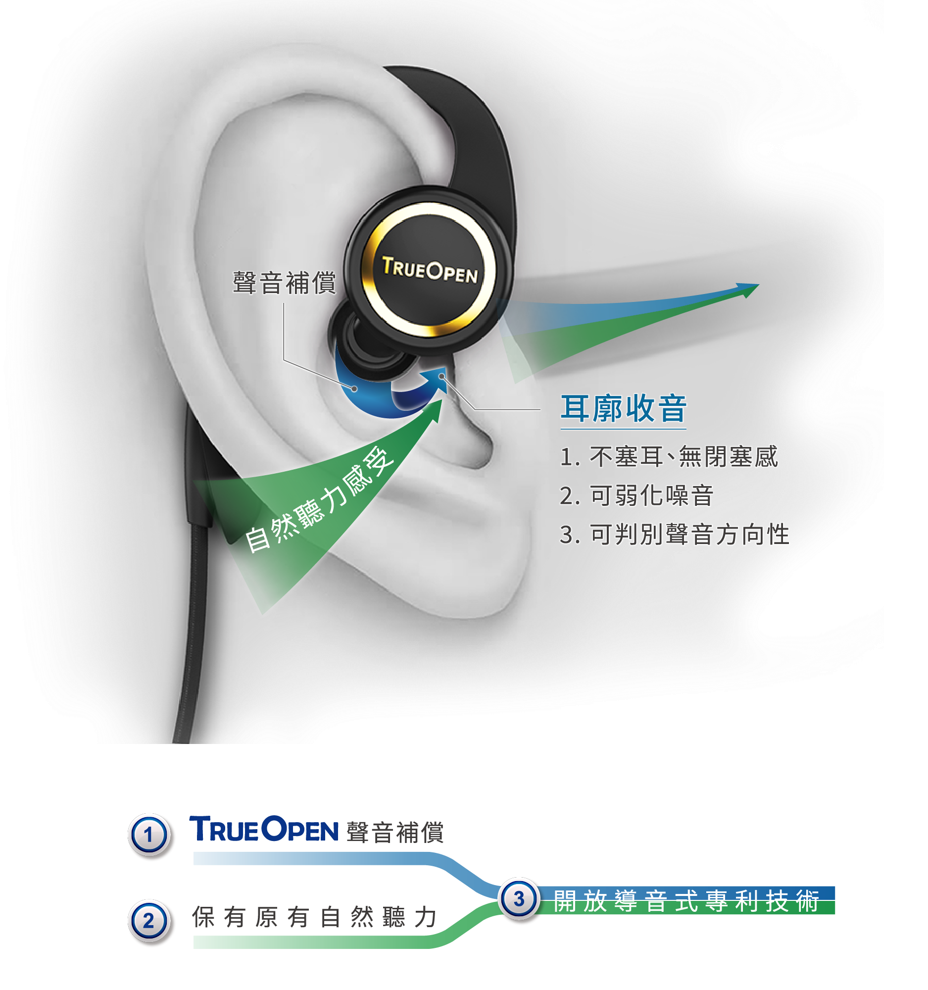 耳道開放.無閉塞感不塞耳道由耳廓收音,接近自然聽覺,提升配戴舒適度。